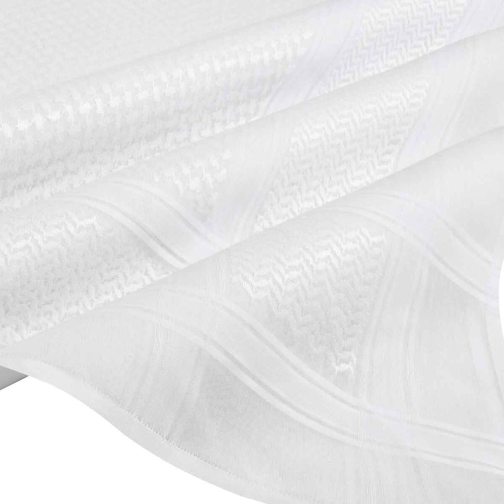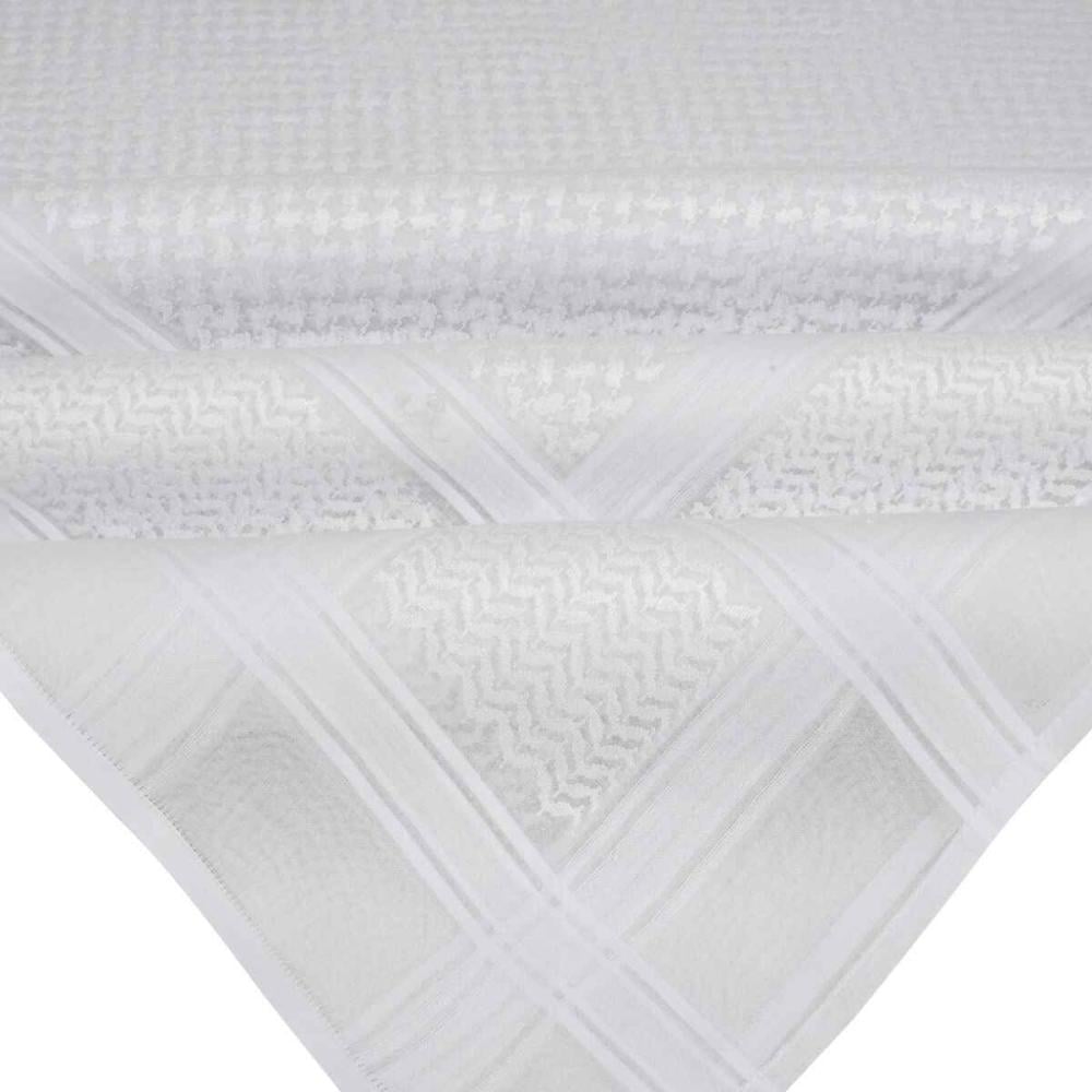 تخيل لفّتك البيضاء النظيفة، حوافّ متناسقة ونقشة خفيفة بالكاد تُرى، لكن حضورك يُرى بوضوح—بساطة أنيقة تُكمل ثوبك وترفع من الوقار.