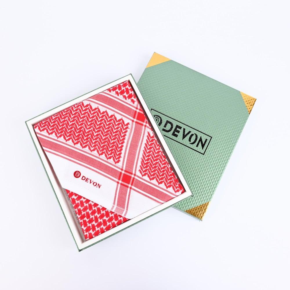 - نوع المنتج: شماغ رجالي Devon Classic 24 بلون أحمر دم الغزال، نقش إنجليزي متوازن وتغليف فاخر.
