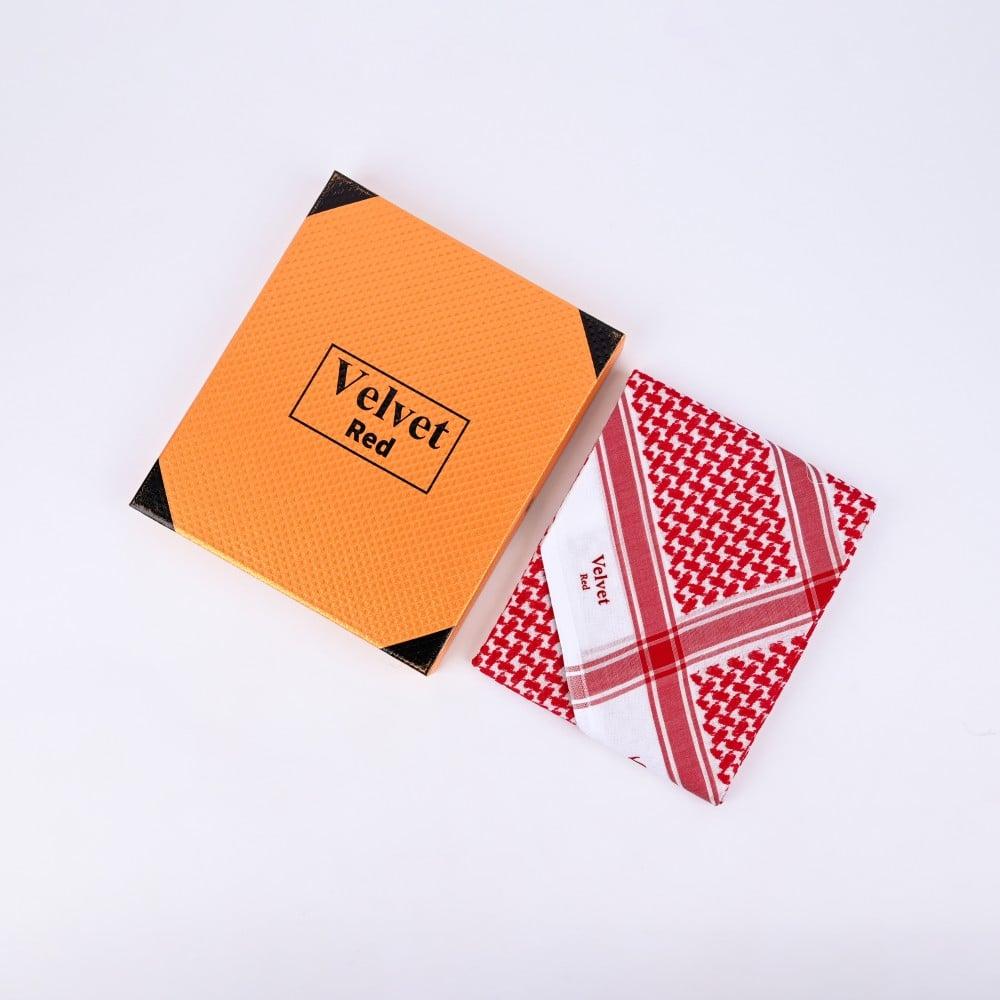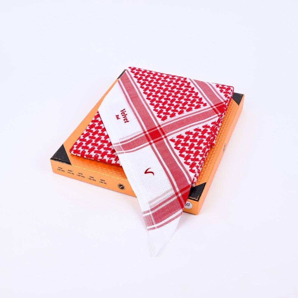 - المنتج: شماغ رجالي Velvet Red – Classic 24 بنقشة إنجليزية دقيقة ولون أحمر غامق يبرز على بياض ناصع.